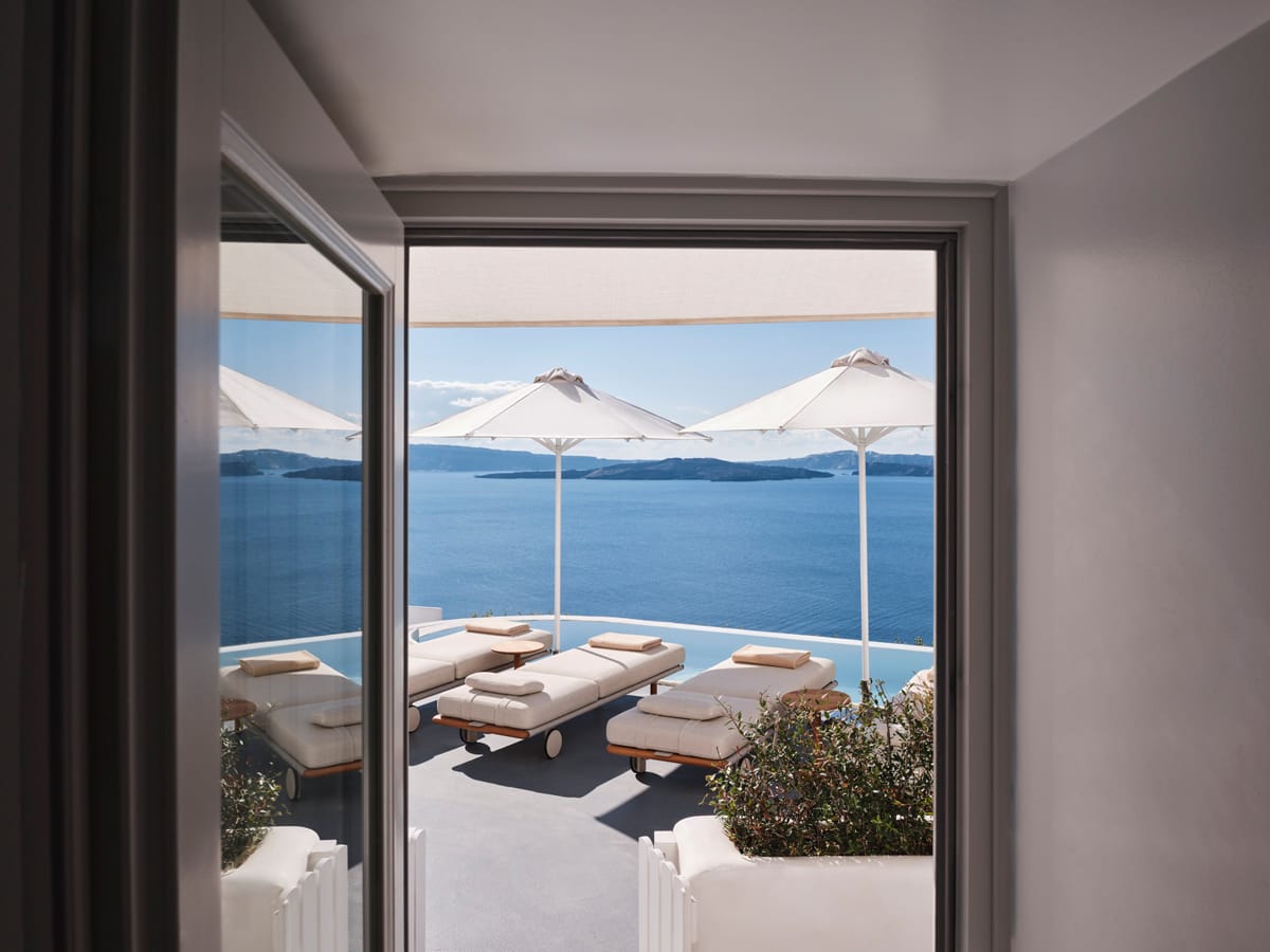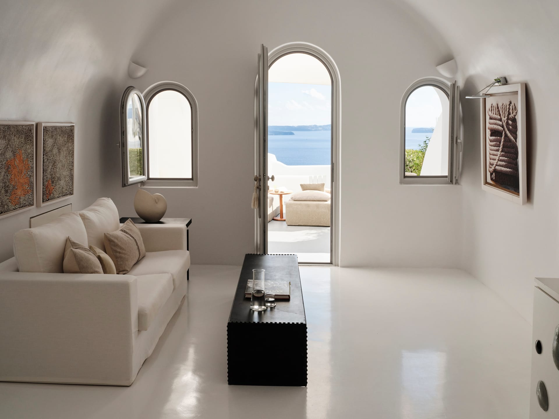 This standard room features one bedroom with a king-size bed and an open-plan sitting and dining area. All the furnishings are custom-made and of high artistic quality. The bathroom comes with a rain shower, while the veranda offers a panoramic view of the volcano, caldera, and the Aegean Sea.