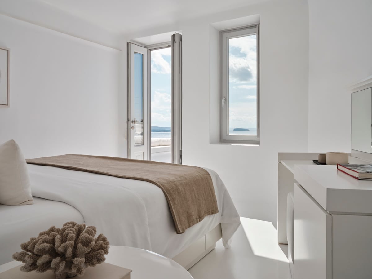 Indulge in relaxation and style on your private veranda, where you can enjoy panoramic views of the Volcano, the Caldera, and the Aegean Sea.